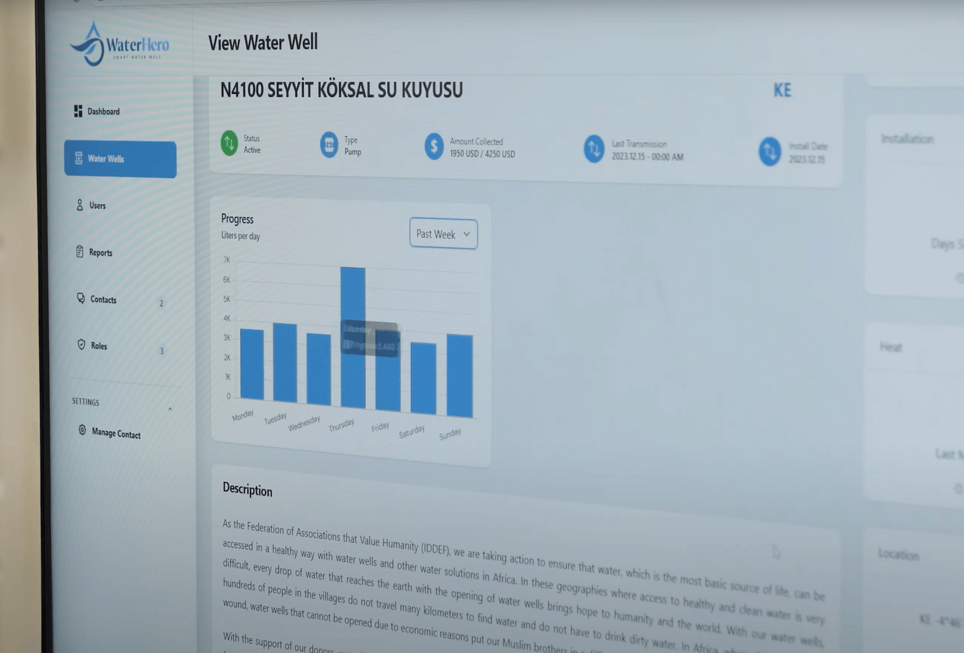 Unsere Forschungs- und Entwicklungsabteilung hat im Rahmen für die Überwachung unserer Wasserbrunnen ein Systems entwickelt, welches den Wasserverbrauch über das Internet weltweit an den Spender und unsere Zentrale übermittelt.
